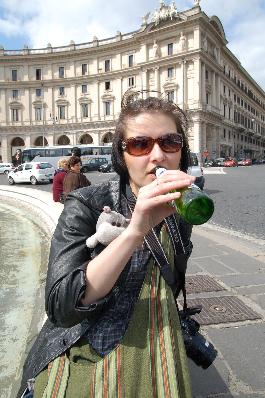 Zwiedzanie kościołów jest takie wyczerpujące. Piwo w torbie takie ciężkie, a fontanna na środku Piazza Republica taka zachęcająca. Długo się nie zastanawiamy i po pokonaniu bariery w postaci mega ruchliwego ronda przysiadamy na popas na murku fontanny. Nadziwić się nie mogę że żaden z przejeżdżających żandarmów czy innych Carabinierów nas nie zgarnął za picie w miejscach publicznych... (FILM o Piazza della Republica)
